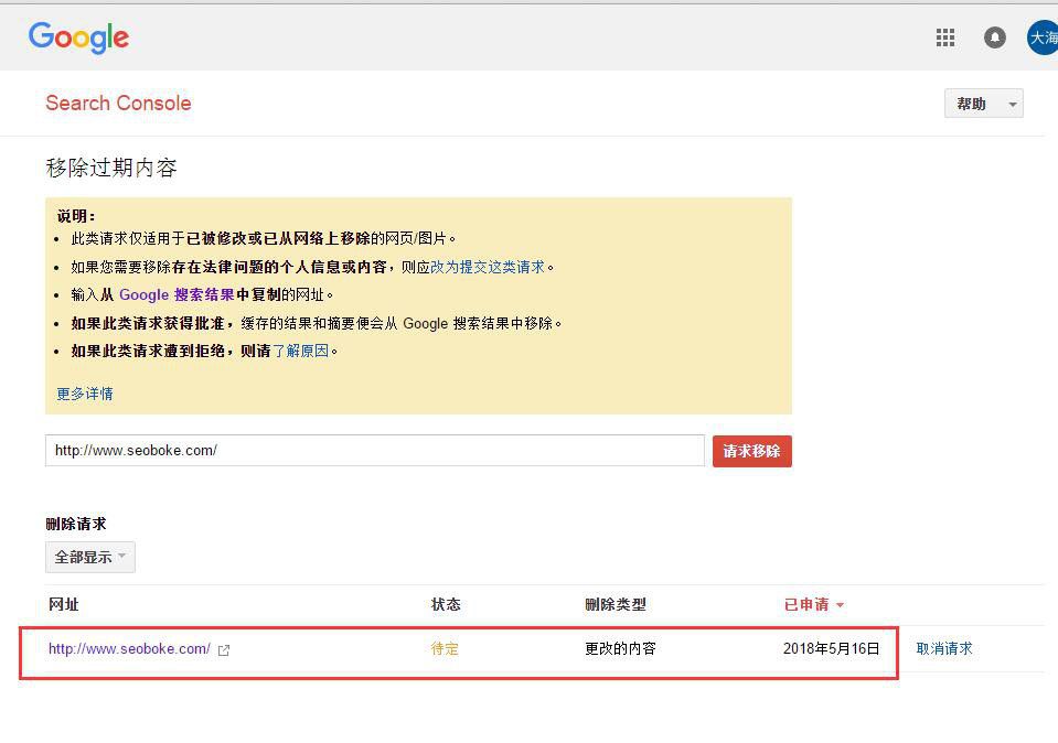 點(diǎn)擊請(qǐng)求移除,下面就可以看到自己的申請(qǐng)記錄了,等待谷歌更新即可